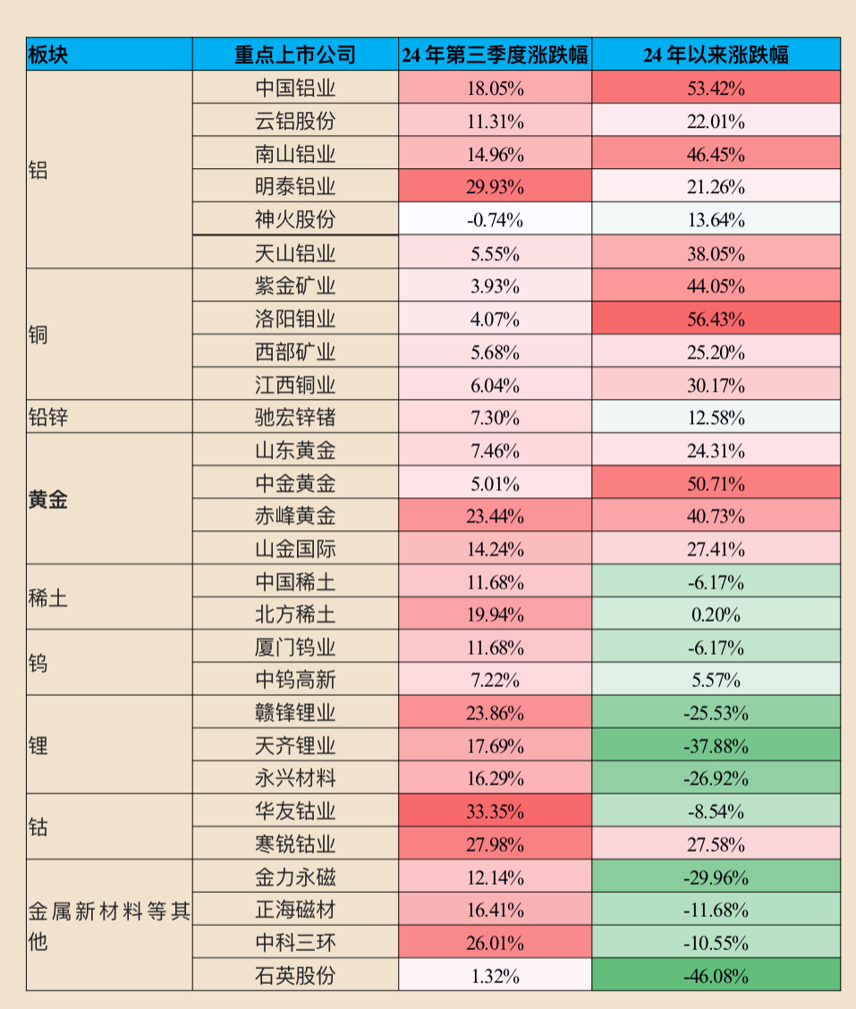 前三季度從需求端來(lái)看,國(guó)內(nèi)針對(duì)性地落地了特別國(guó)債帶動(dòng)的部分基建、制造業(yè)升級(jí)、設(shè)備更新及數(shù)據(jù)中心等項(xiàng)目,不但充分平滑了地產(chǎn)竣工環(huán)節(jié)的影響,而且?guī)?dòng)部分供給剛性的內(nèi)需品步入錯(cuò)配周期(鋁、鋅等)。隨著0924以來(lái)各部委對(duì)內(nèi)需預(yù)期和中長(zhǎng)期流動(dòng)性的再引導(dǎo),市場(chǎng)重新修正需求預(yù)期,修復(fù)強(qiáng)現(xiàn)實(shí)的低估內(nèi)需品,因此,綜合前三季度來(lái)看鋁、銅等漲幅居前。且第三季度來(lái)看,前期受預(yù)期及流動(dòng)性超跌的能源金屬及新材料修復(fù)較多,持續(xù)性有望隨內(nèi)需及政策逐步提速。