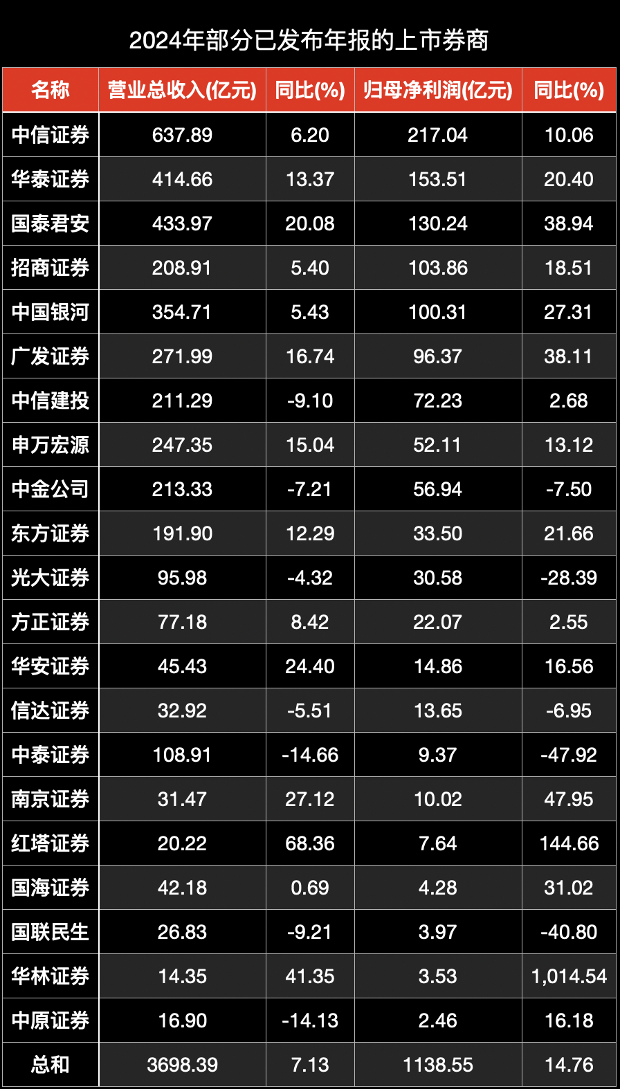 作為證券行業(yè)的“主力軍”,截至《證券日報》記者發(fā)稿,已有21家上市券商發(fā)布了2024年年報,合計實現(xiàn)營業(yè)收入3698.39億元,同比增長7.13%;實現(xiàn)歸母凈利潤1138.55億元,同比增長14.76%。其中,中信證券、華泰證券、國泰君安等頭部券商更是展現(xiàn)不俗實力,業(yè)績表現(xiàn)可圈可點。