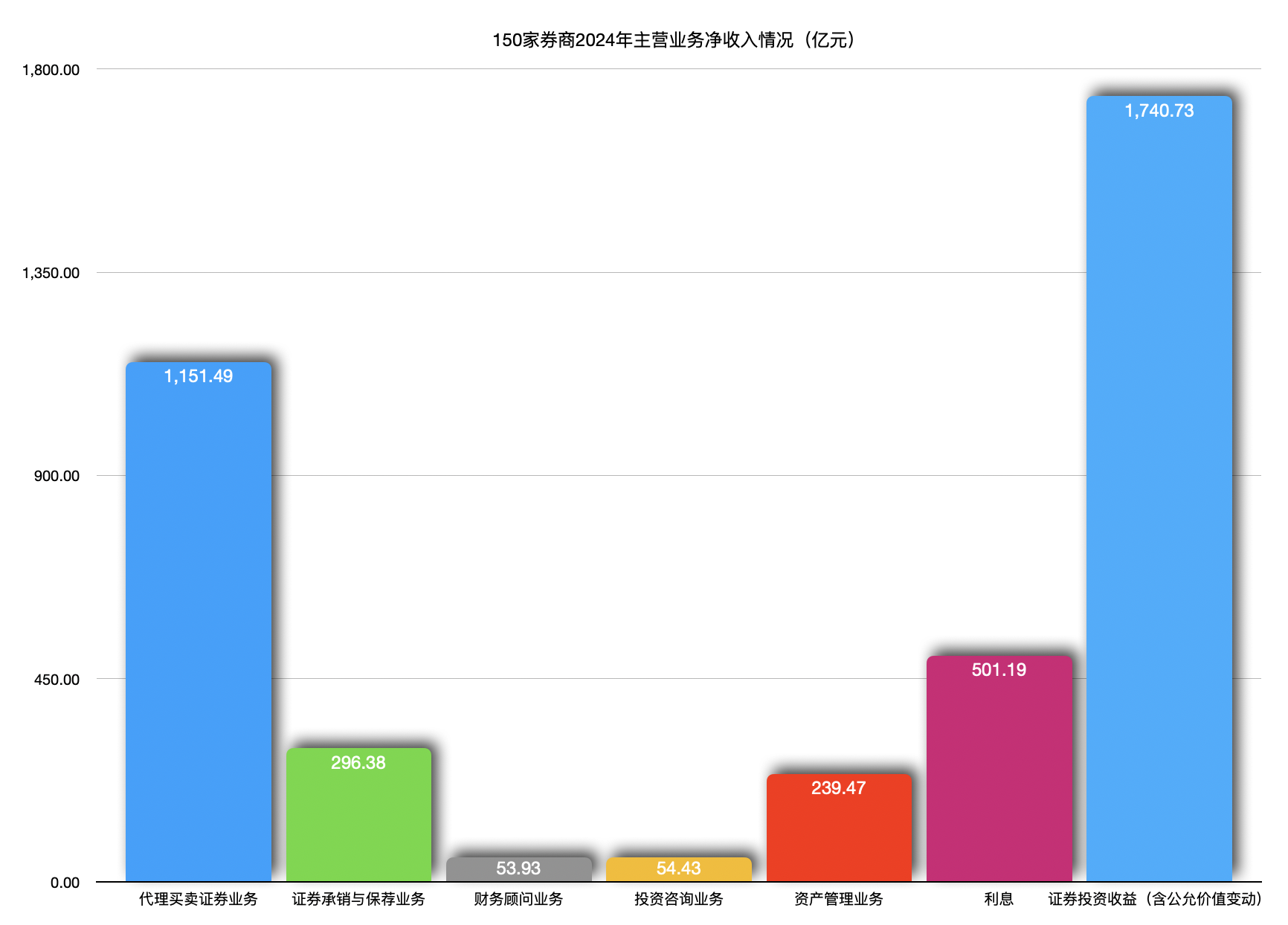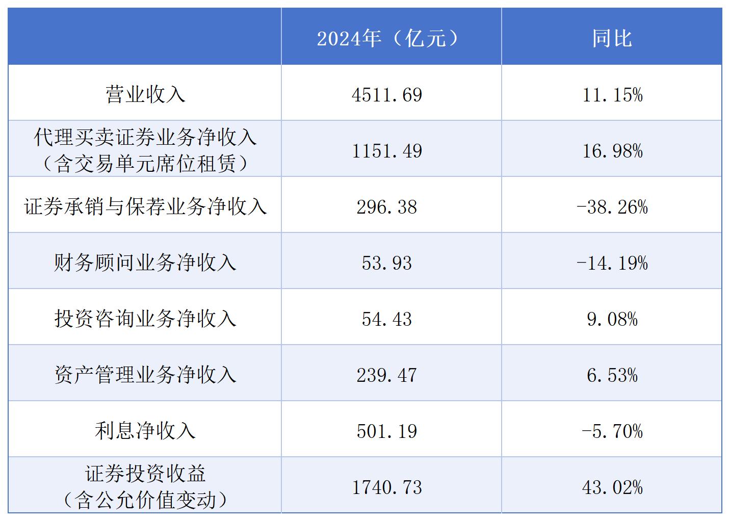 聚焦主營業(yè)務(wù)收入情況,2024年,券商代理買賣證券業(yè)務(wù)凈收入(含交易單元席位租賃)1151.49億元,同比增長16.98%;證券承銷與保薦業(yè)務(wù)凈收入296.38億元,同比下降38.26%;財務(wù)顧問業(yè)務(wù)凈收入53.93億元,同比下降14.19%;投資咨詢業(yè)務(wù)凈收入54.43億元,同比增長9.08%;資產(chǎn)管理業(yè)務(wù)凈收入239.47億元,同比增長6.53%;利息凈收入501.19億元,同比下降5.7%;證券投資收益(含公允價值變動)1740.73億元,同比增長43.02%。