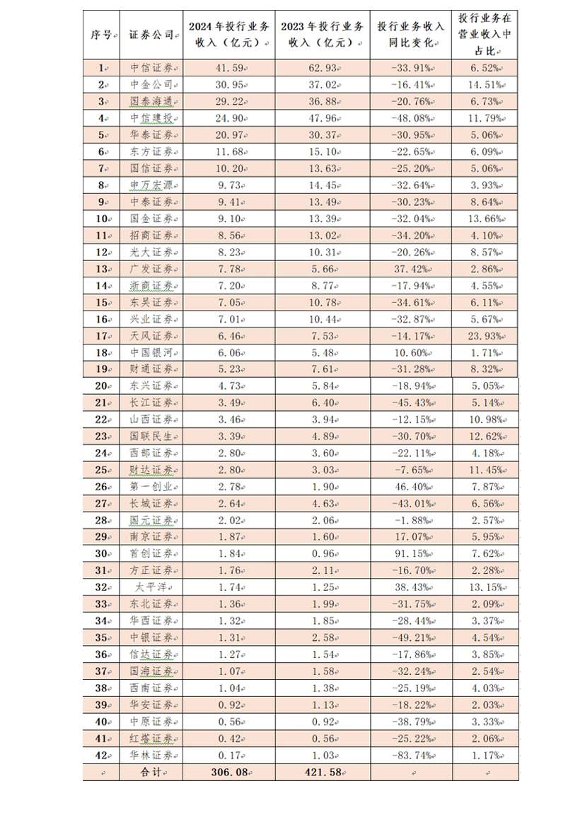 受行業(yè)周期影響,上市券商投行業(yè)務仍未走出低迷。根據(jù)年報數(shù)據(jù),42家上市券商2024年投資銀行業(yè)務共實現(xiàn)手續(xù)費凈收入306.08億元,較2023年的421.58億元,下降27.40%,行業(yè)同比變化中位數(shù)是-25.19%,這反映出投行業(yè)務收入下滑已經成為行業(yè)普遍現(xiàn)象。上市券商中,首創(chuàng)證券、第一創(chuàng)業(yè)證券、太平洋證券、廣發(fā)證券、南京證券、中國銀河證券等6家投行業(yè)務收入實現(xiàn)正增長,占比僅為14.29%。國元證券、財達證券等投行業(yè)務收入保持穩(wěn)定,而多數(shù)券商投行業(yè)務則出現(xiàn)較大幅度的下滑。從年報數(shù)據(jù)還能看出,投行業(yè)務收入在上市券商整體收入規(guī)模中占比不高,僅有中金公司、中信建投、國金證券、天風證券、山西證券、財達證券、太平洋證券等少數(shù)上市券商投行收入在營業(yè)收入中占比超10%。