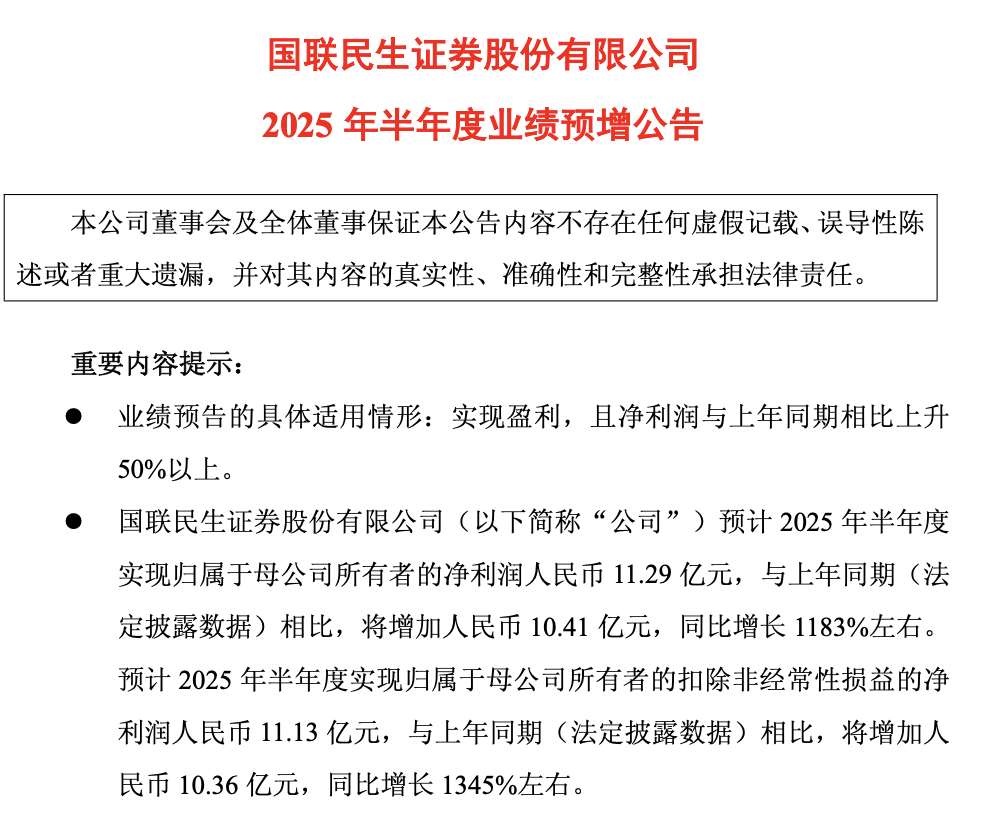 從具體數據來看,國聯民生預計,2025年半年度實現歸屬于母公司所有者的凈利潤11.29億元,與上年同期(法定披露數據)相比,將增加10.41億元,同比增長1183%左右。預計2025年半年度實現歸屬于母公司所有者的扣除非經常性損益的凈利潤11.13億元,與上年同期(法定披露數據)相比,將增加10.36億元,同比增長1345%左右。