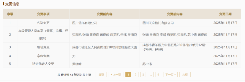 本報訊 (記者方凌晨)11月17日,國家企業(yè)信用信息公示系統(tǒng)顯示,“四川信托有限公司”更名為“四川天府信托有限公司”,同時高級管理人員備案(董事、監(jiān)事、經(jīng)理等)、地址信息、公司章程、法定代表人等多個事項發(fā)生變更。