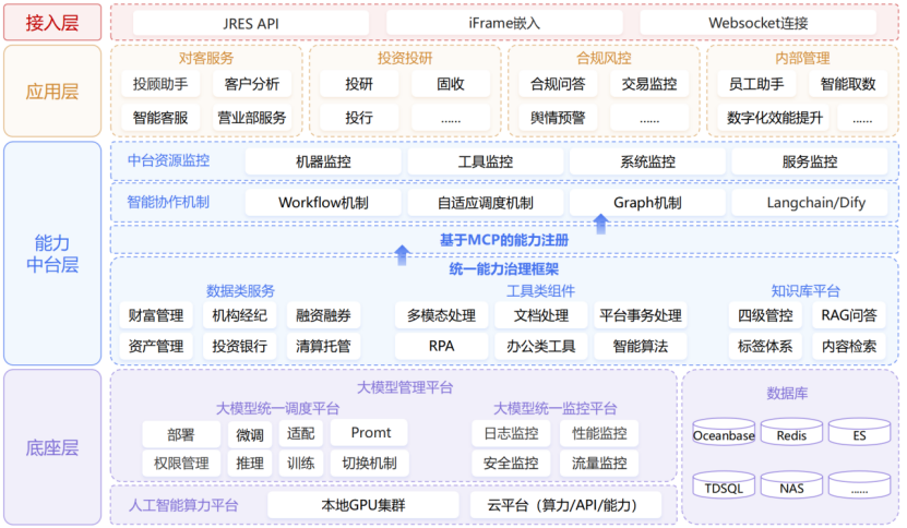 其中,“一體”指自主可控的大模型基座,是整個(gè)服務(wù)體系的核心,保障技術(shù)應(yīng)用的自主性和安全性;“四翼”對(duì)應(yīng)對(duì)客服務(wù)、投資投研、合規(guī)風(fēng)控、內(nèi)部管理四大核心業(yè)務(wù)領(lǐng)域,全面覆蓋公司關(guān)鍵業(yè)務(wù)環(huán)節(jié)。