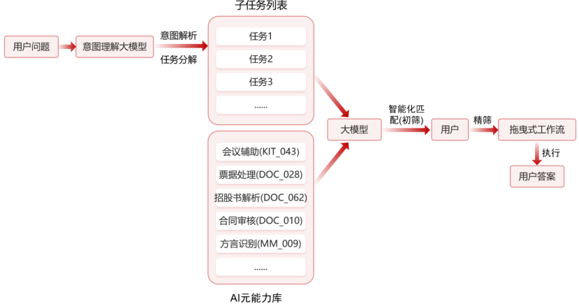 通過(guò)智能匹配機(jī)制為各子任務(wù)篩選最優(yōu)AI能力組合,結(jié)合業(yè)務(wù)規(guī)則、資源負(fù)載情況與歷史應(yīng)用效果,從能力資產(chǎn)庫(kù)中動(dòng)態(tài)調(diào)取適配的工具、數(shù)據(jù)與知識(shí)資源,形成候選能力集合;再由用戶結(jié)合業(yè)務(wù)需求精度要求、操作習(xí)慣等因素進(jìn)行精準(zhǔn)優(yōu)化,既保障了自動(dòng)化處理的效率,又保留了人工干預(yù)的靈活性,充分體現(xiàn)“以用戶為中心”的設(shè)計(jì)理念。