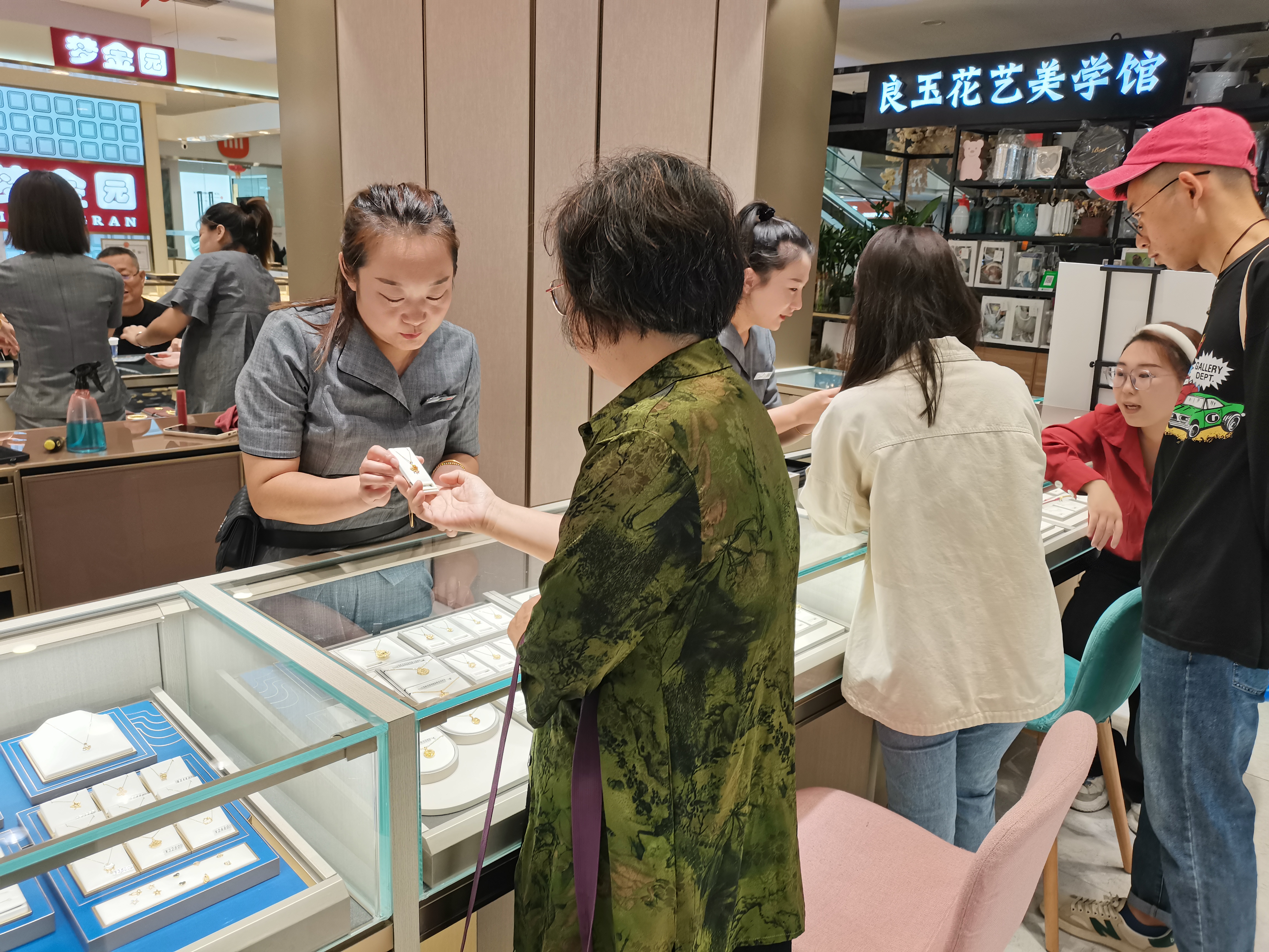 9月10日,河北省張家口市一家百貨商城一層的黃金銷售區(qū)內(nèi)顧客絡繹不絕,多處黃金柜臺有顧客往來咨詢、試戴、購買黃金產(chǎn)品。