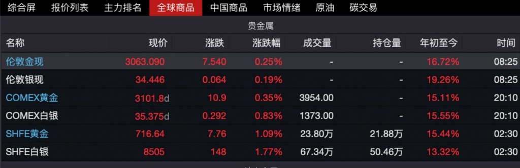 具體來看,北京時間3月27日22:50倫敦金現(xiàn)刷新歷史高位至3059.63美元/盎司。COMEX黃金期貨漲1.53%,報3068.60美元/盎司,COMEX黃金23:36也曾漲至3071.30美元/盎司創(chuàng)歷史新高;COMEX黃金6月合約漲1.51%,報3098.50美元/盎司,23:36曾刷新盤中歷史高位至3102.20美元/盎司。SHFE黃金盤中最高升至717.70元/克。