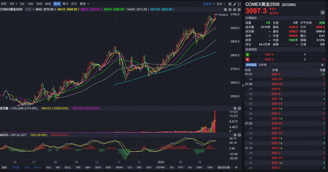 黃金市場避險交易情緒升溫,3月27日深夜黃金再度狂飆,COMEX黃金6月盤中擊破3100美元/盎司。