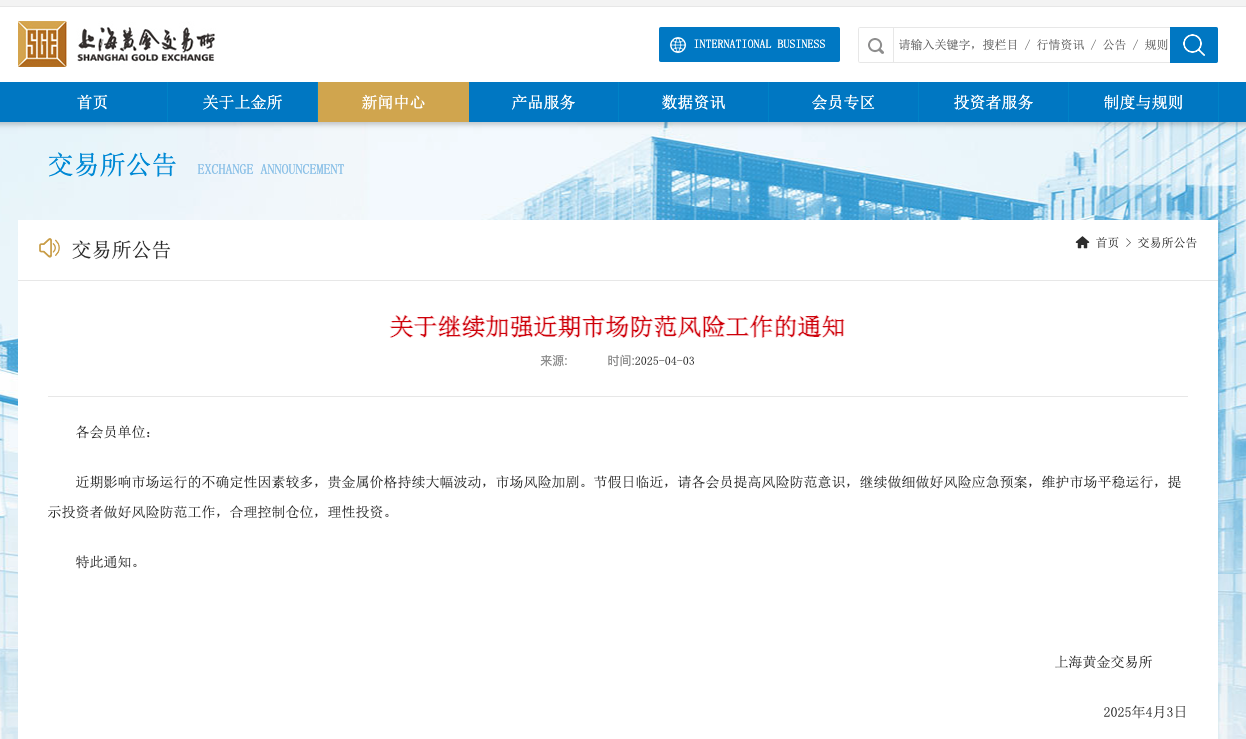 同日,上海黃金交易所(簡稱“上金所”)發(fā)布《關(guān)于繼續(xù)加強(qiáng)近期市場(chǎng)防范風(fēng)險(xiǎn)工作的通知》(以下簡稱《通知》)。《通知》稱,近期影響市場(chǎng)運(yùn)行的不確定性因素較多,貴金屬價(jià)格持續(xù)大幅波動(dòng),市場(chǎng)風(fēng)險(xiǎn)加劇。