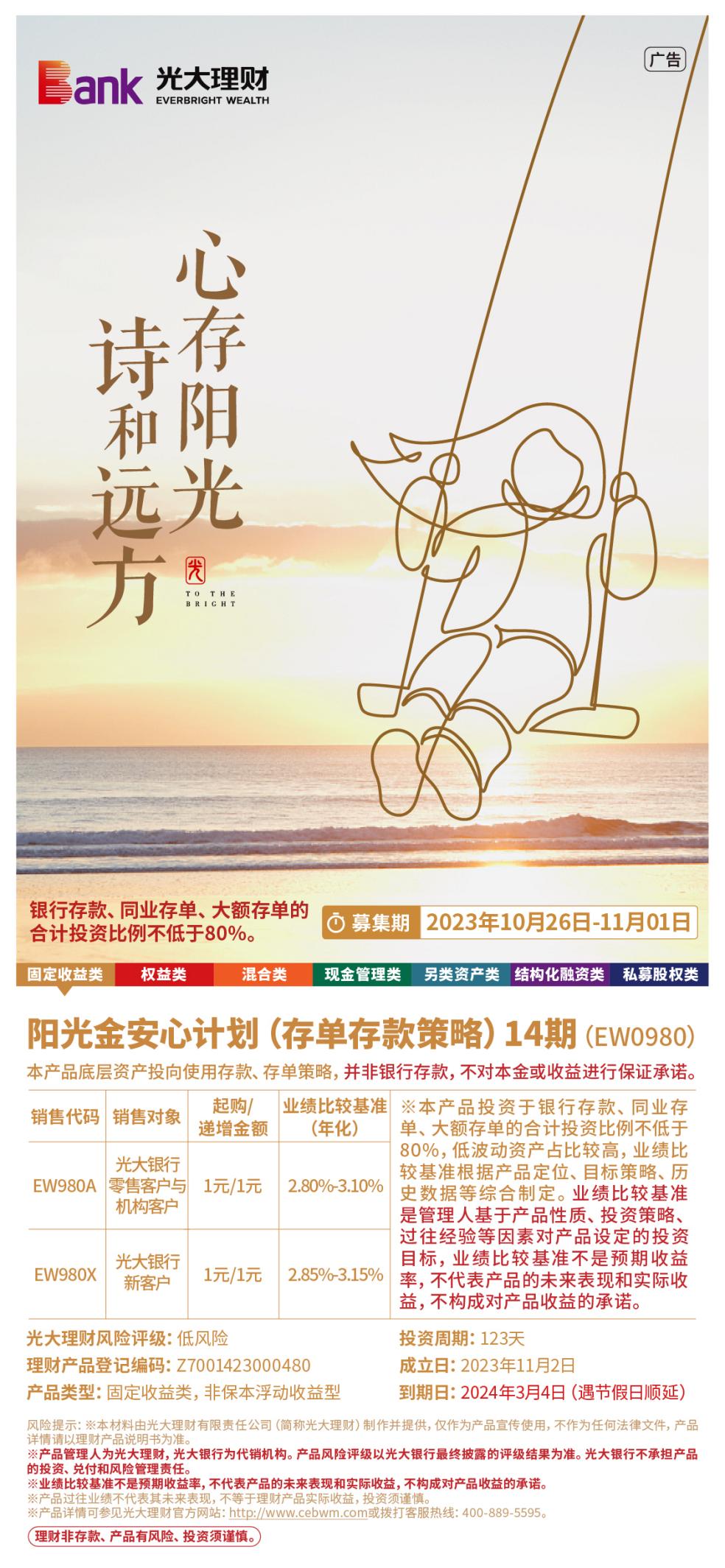 “陽光金安心計(jì)劃(存單存款策略)”就非常具有代表性。該系列是光大理財(cái)旗下一款封閉式固定收益類產(chǎn)品系列,以策略穩(wěn)健、追求低波、費(fèi)率較低為特色。