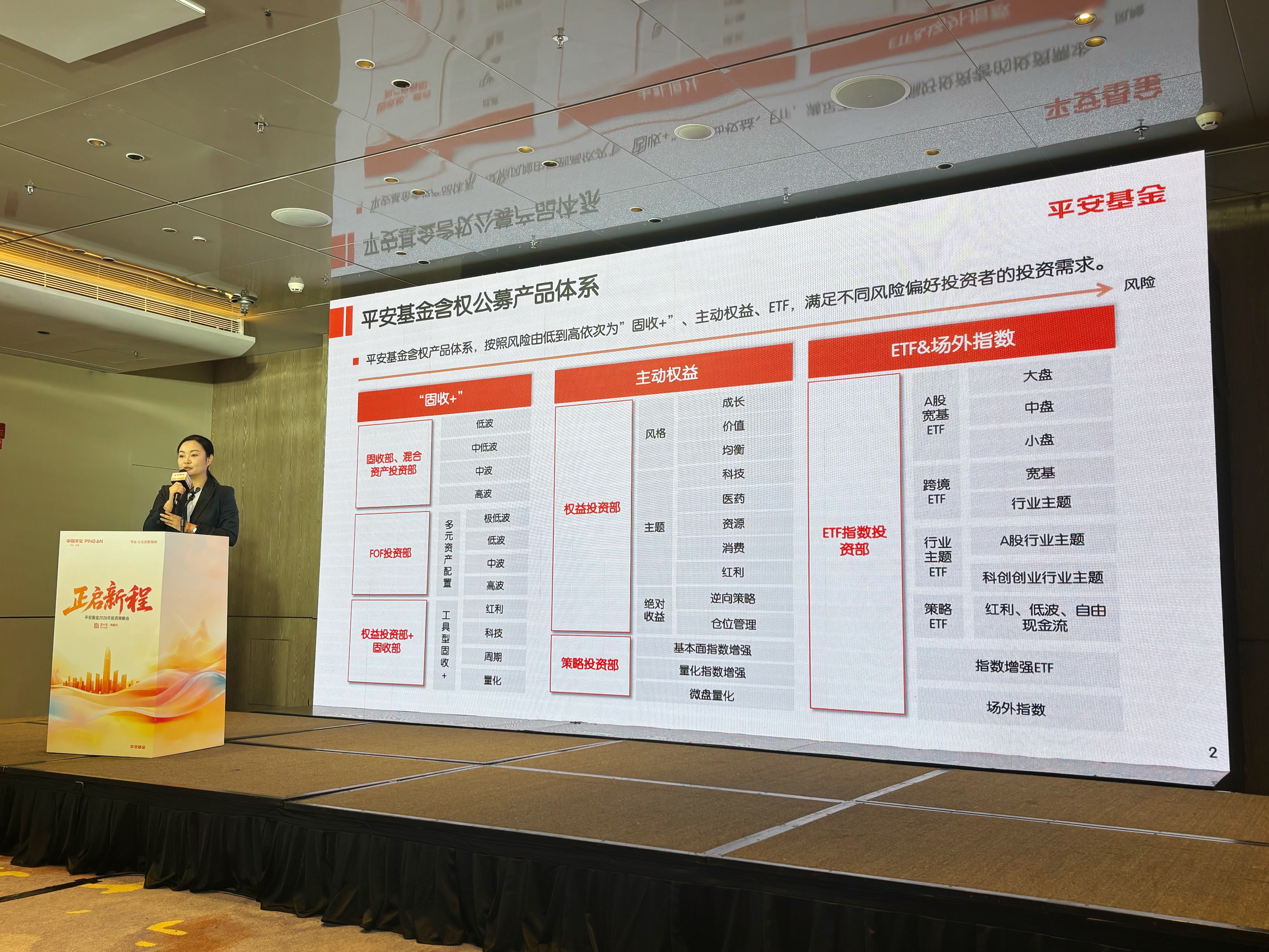 本報訊 (記者昌校宇)1月7日,以“正啟新程”為主題的平安基金2026年投資策略會在深圳舉行。平安基金產(chǎn)品研發(fā)部總經(jīng)理謝娜在做《多團隊、多風(fēng)格、多策略——平安基金含權(quán)公募產(chǎn)品體系介紹》主題演講時展現(xiàn)了平安基金覆蓋不同風(fēng)險收益特征的投資版圖,通過構(gòu)建多層次含權(quán)產(chǎn)品體系,精準(zhǔn)匹配不同風(fēng)險偏好的投資者需求?!蹲C券日報》記者從現(xiàn)場獲悉,該體系依據(jù)風(fēng)險由低到高,清晰劃分為“固收+”、主動權(quán)益和ETF三大板塊,旨在為投資者提供一站式的資產(chǎn)配置解決方案。
