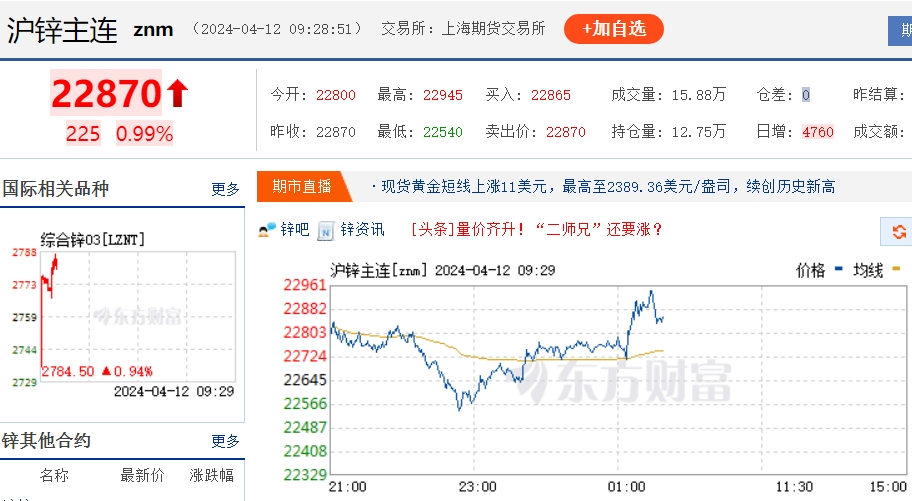 早盤國內鋅價接近23000點大關(供圖:東方財富)
