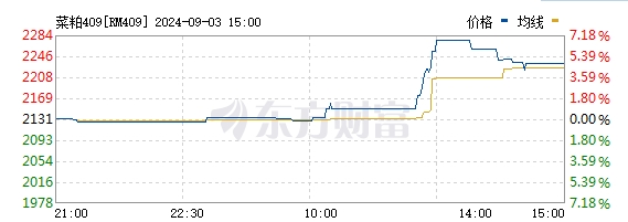 行情方面,菜油409合約收盤時(shí)上漲4.52%,報(bào)收于8749元/噸,其他月份的菜油期貨合約亦有明顯上漲。菜粕409合約收盤時(shí)上漲4.79%,報(bào)收于2233元/噸,其他月份的菜粕期貨合約亦有明顯上漲。值得一提的是,菜油、菜粕期貨各月份合約呈現(xiàn)“近低遠(yuǎn)高”的格局,表明交易者對菜油、菜粕價(jià)格走高有一定信心。