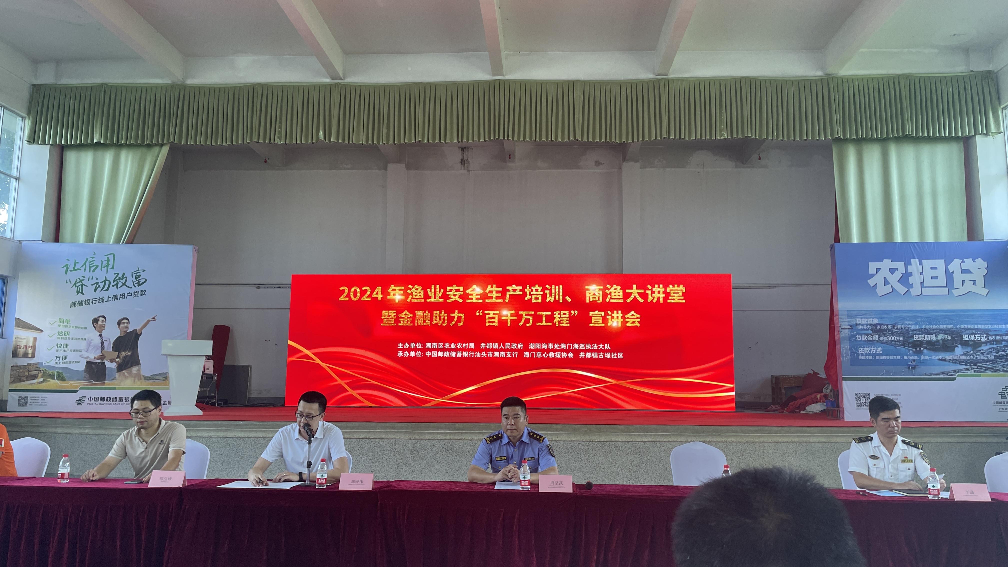 日前,郵儲銀行汕頭市潮南支行聯(lián)合汕頭市潮南區(qū)井都鎮(zhèn)人民政府、汕頭市潮南區(qū)農(nóng)業(yè)農(nóng)村局舉辦2024年漁業(yè)安全生產(chǎn)培訓(xùn)、商漁大講堂暨金融助力“百千萬工程”宣講會。
