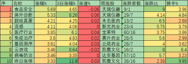 從個(gè)股來(lái)看,上述三類概念板塊涉及61只個(gè)股,其中,10只個(gè)股最近4個(gè)季度累計(jì)凈利潤(rùn)虧損,動(dòng)態(tài)市盈率(TTM)無(wú)法計(jì)算,此外,即使以機(jī)構(gòu)普遍看好未來(lái)發(fā)展的科創(chuàng)板整體市盈率85.90倍為標(biāo)準(zhǔn),這些概念股中也有22只在此之上,這樣算起來(lái),上述概念股中估值較高股占比已達(dá)五成以上。再回過(guò)頭來(lái)看看周一逆市上漲的醫(yī)療概念股??梢园l(fā)現(xiàn)食品安全、體外診斷、超級(jí)真菌等等概念板塊排在板塊監(jiān)測(cè)前列,漲幅均超過(guò)4%,在滬深兩市大盤均下跌的背景下,一枝獨(dú)秀。