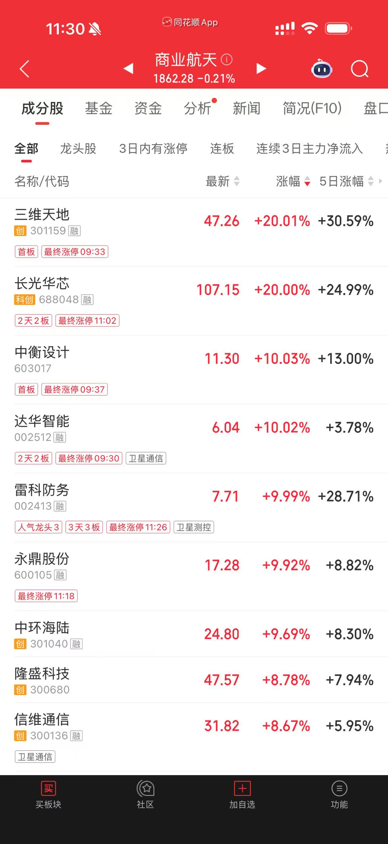 截至上午收盤(pán),三維天地(301159)、長(zhǎng)光華芯(688048)達(dá)成“20cm”漲停,中衡設(shè)計(jì)(603017)、達(dá)華智能(002512)、雷科防務(wù)(002413)、永鼎股份(600105)等多股漲停,中環(huán)海陸(301040)、乾照光電(300102)、信維通信(300136)、隆盛科技(300680)等個(gè)股漲超8%。