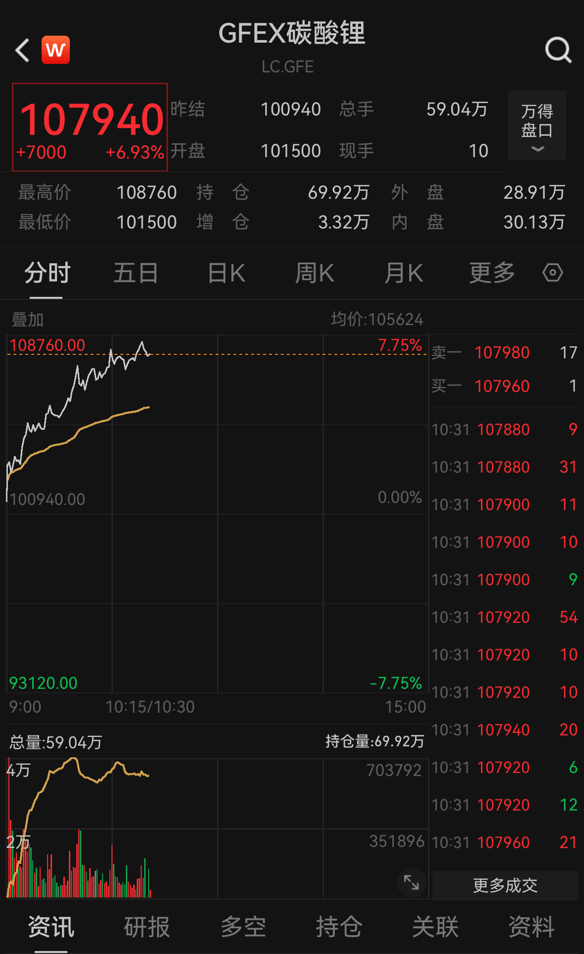12月17日早間開(kāi)盤(pán),廣期所碳酸鋰主力合約漲幅一度沖高至7.75%,報(bào)10.88萬(wàn)元/噸,價(jià)格創(chuàng)下自2024年5月份以來(lái)的新高,年內(nèi)累計(jì)漲幅超40%。