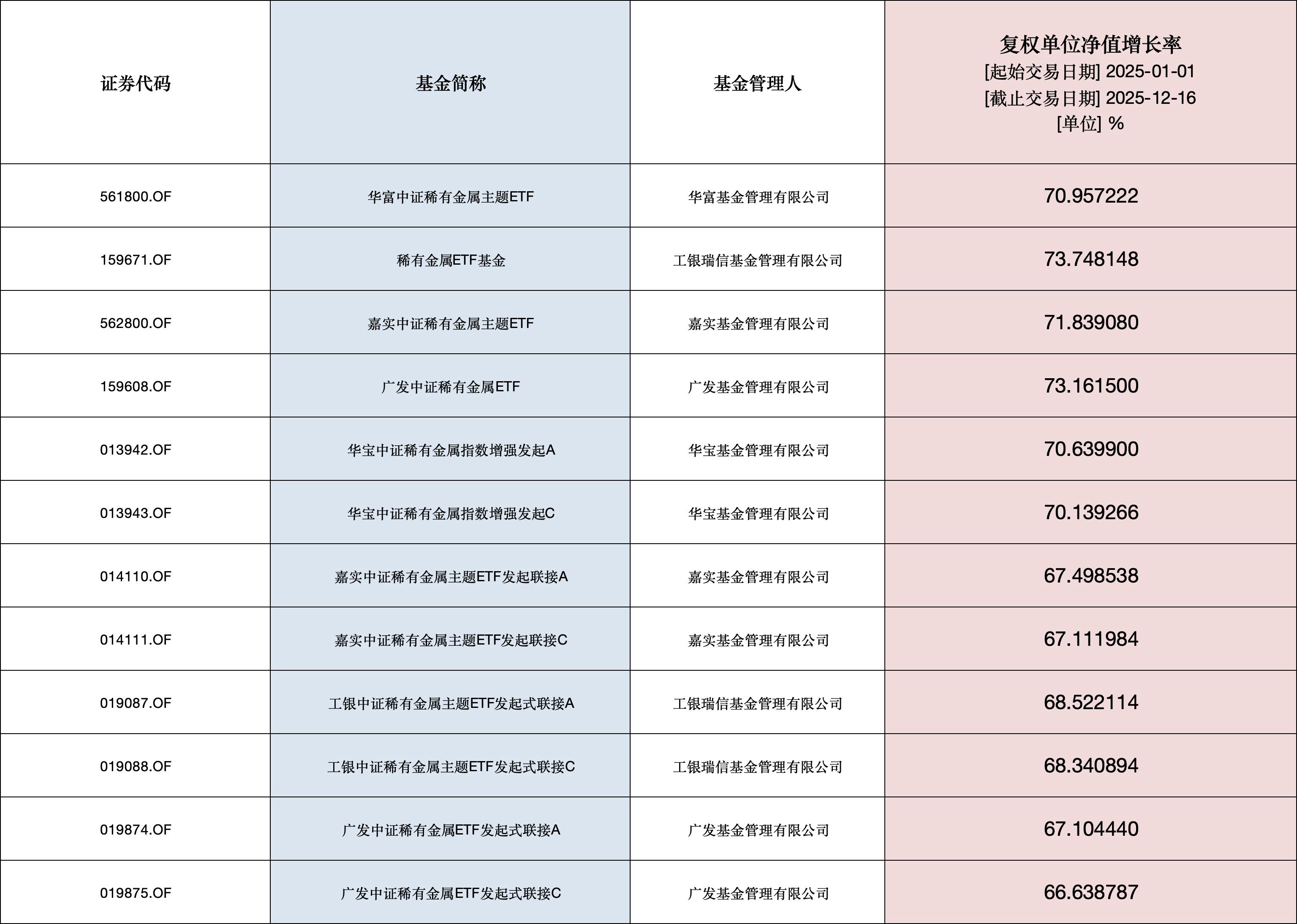 在稀有金屬ETF方面,Wind資訊數(shù)據(jù)顯示,截至12月16日,今年以來(lái)12只“稀有金屬ETF”凈值增長(zhǎng)率平均達(dá)69.64%,表現(xiàn)十分亮眼。其中,華富中證稀有金屬主題ETF、稀有金屬ETF基金、嘉實(shí)中證稀有金屬主題ETF、廣發(fā)中證稀有金屬ETF、華寶中證稀有金屬指數(shù)增強(qiáng)發(fā)起A、華寶中證稀有金屬指數(shù)增強(qiáng)發(fā)起C等6只ETF年內(nèi)凈值增長(zhǎng)率均超70%。