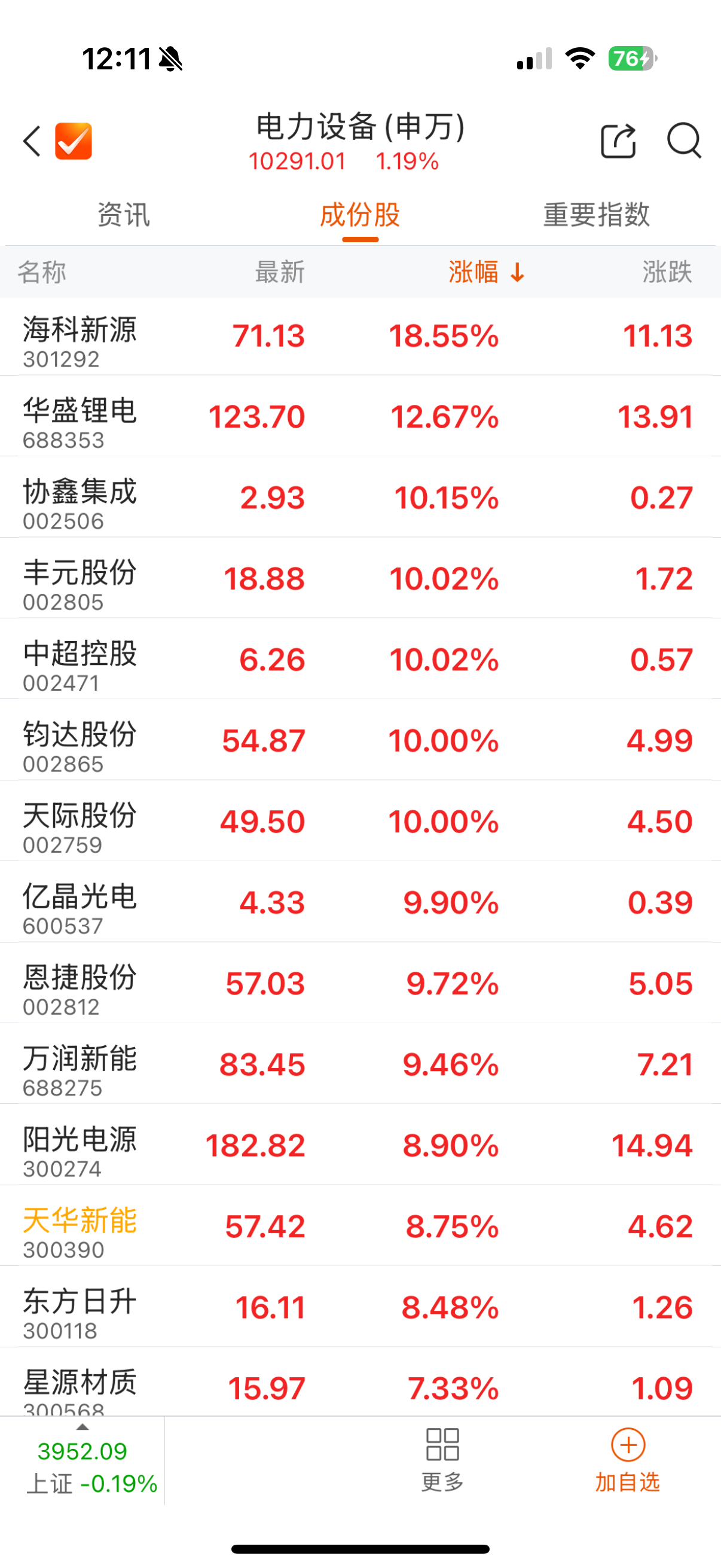 電力設(shè)備板塊跟隨光伏板塊同步走高,細(xì)分賽道標(biāo)的表現(xiàn)活躍。海科新源(301292)漲幅領(lǐng)跑,達(dá)18.55%;華盛鋰電(688353)上漲12.67%;豐元股份(002805)、中超控股(002471)、鈞達(dá)股份(002865)、天際股份(002759)均收獲漲停,板塊內(nèi)熱門標(biāo)的普漲態(tài)勢(shì)顯著。