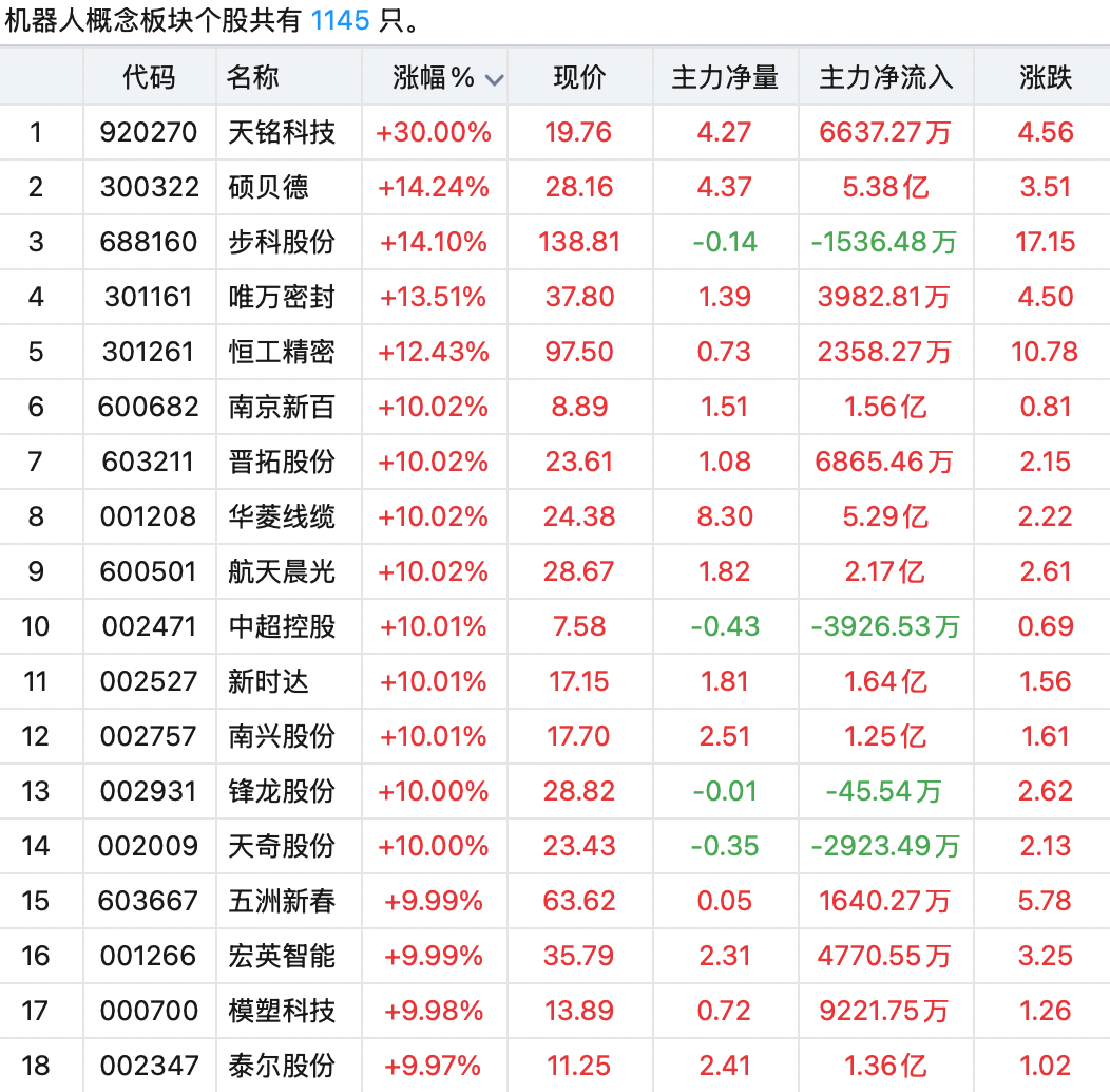 截至上午收盤,天銘科技(920270)(“30cm”漲停)、南京新百(600682)、晉拓股份(603211)、華菱線纜(001208)、航天晨光(600501)、中超控股(002471)、新時(shí)達(dá)(002527)、南興股份(002757)、鋒龍股份(002931)、天奇股份(002009)、五洲新春(603667)、宏英智能(001266)、模塑科技(000700)、泰爾股份(002347)等14只機(jī)器人概念股漲停。其中,鋒龍股份達(dá)成5連板,天奇股份、泰爾股份4連板。