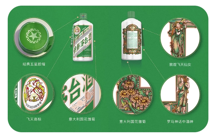 貴州茅臺(tái)酒(走進(jìn)系列·意大利)提取意大利國(guó)旗的綠色和國(guó)花雛菊的白色匯入產(chǎn)品設(shè)計(jì)之中,融合文藝復(fù)興與東方神韻,共譜東西文明交響樂(lè)章。