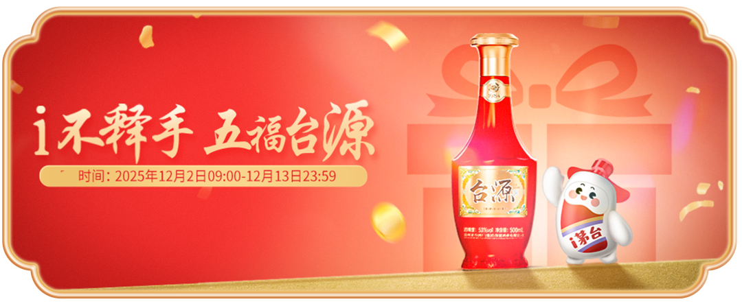 12月2日09:00-12月13日23:59,開(kāi)啟“i不釋手 五福臺(tái)源”活動(dòng)。每購(gòu)買(mǎi)2瓶53%vol500ml臺(tái)源(紅),贈(zèng)臺(tái)源酒具1套,購(gòu)1-5瓶還可參與抽米家充氣寶。每購(gòu)買(mǎi)1箱(6瓶)53%vol500ml臺(tái)源(紅),贈(zèng)保健酒業(yè)定制背包1個(gè),再抽科沃斯掃地機(jī)器人X9(水箱版)、HUAWEl FreeBuds pro 4悅彰耳機(jī)、米家Mini洗衣機(jī)1kg。多買(mǎi)多贈(zèng),嗨購(gòu)不打烊。