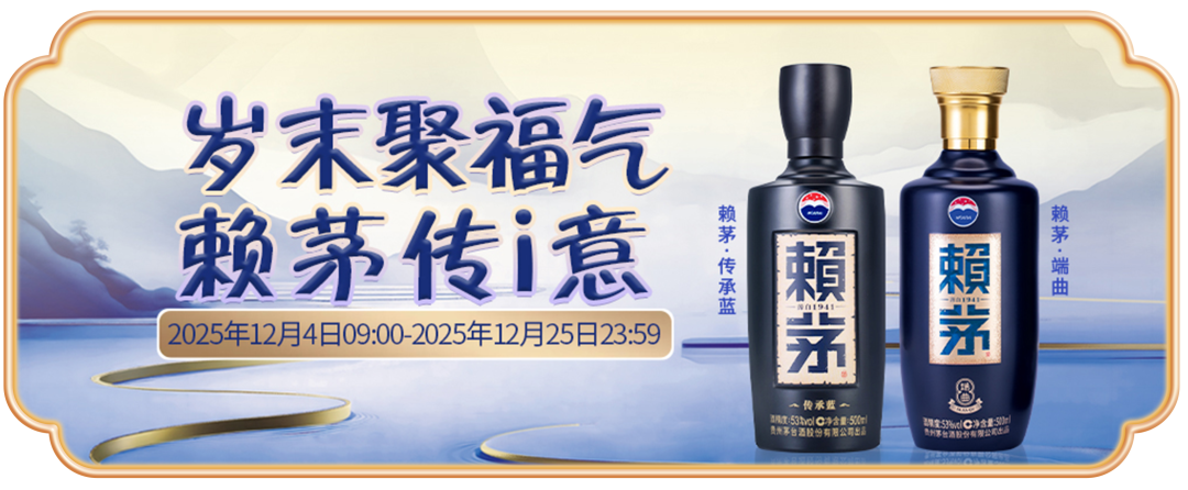 12月4日09:00-12月25日23:59,開(kāi)啟“歲末聚福氣 賴(lài)茅傳i意”活動(dòng)。購(gòu)53%vol500ml賴(lài)茅酒(端曲)(2.0)享258元/瓶活動(dòng)價(jià)(零售價(jià)418元/瓶),購(gòu)買(mǎi)達(dá)指定數(shù)量可分別獲贈(zèng)賴(lài)茅定制SKG頸部按摩儀、特美刻牌保溫杯等禮品。購(gòu)53%vol500ml賴(lài)茅酒(傳承·藍(lán))(2.0)享338元/瓶活動(dòng)價(jià)(零售價(jià)568元/瓶),購(gòu)買(mǎi)達(dá)指定數(shù)量可分別獲贈(zèng)賴(lài)茅定制外交官拉桿箱、賴(lài)茅虎年生肖酒等禮品。舉信賴(lài),敬真情。