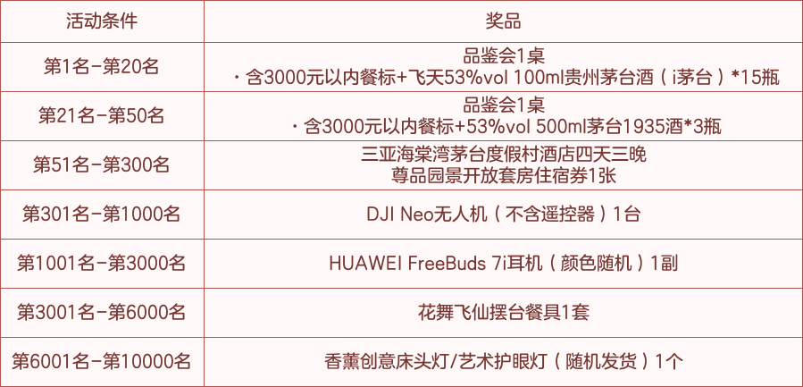 11月29日09:00-12月25日23:59,開(kāi)啟“購(gòu)物有禮 消費(fèi)回饋季”活動(dòng)。親們?cè)趇茅臺(tái)App購(gòu)買(mǎi)任意產(chǎn)品并確認(rèn)收貨,累計(jì)消費(fèi)積分排名(每消費(fèi)1元可獲得1積分)前10000名有好禮!消費(fèi)回饋、獎(jiǎng)品豐厚。