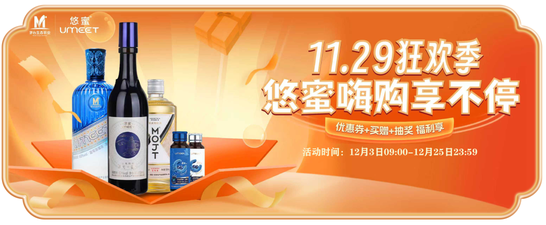 12月3日09:00-12月25日23:59,開(kāi)啟“11·29狂歡季 悠蜜嗨購(gòu)享不停”活動(dòng)。上i茅臺(tái)App買(mǎi)悠蜜產(chǎn)品,為甜蜜加碼:①領(lǐng)券立減:10000張滿(mǎn)減券大放送,可用于購(gòu)買(mǎi)悠蜜藍(lán)莓精釀?dòng)鲆?jiàn)·藍(lán)雪、UMEET靛嵐藍(lán)莓蒸餾酒40%vol等產(chǎn)品。②多買(mǎi)多贈(zèng):莫其托貴州味道系列雞尾酒藍(lán)莓酸“買(mǎi)一贈(zèng)一”、umeet二倍濃縮藍(lán)莓汁(復(fù)原)“買(mǎi)五贈(zèng)三”。③幸運(yùn)抽獎(jiǎng):購(gòu)買(mǎi)任意悠蜜活動(dòng)產(chǎn)品,抽500/200/100元抵扣券。有i有禮,甜甜蜜蜜。