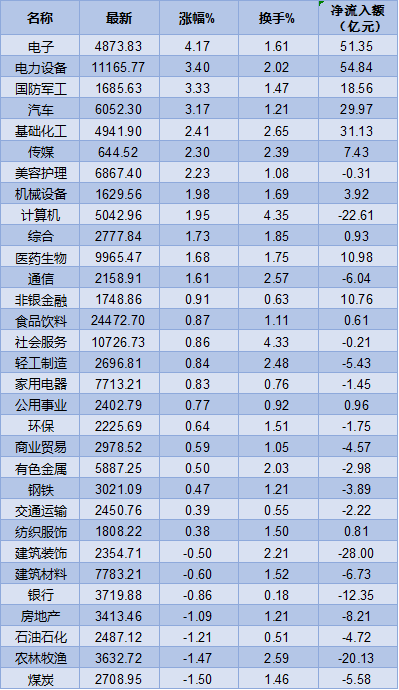 從申萬一級行業(yè)來看,有24類行業(yè)上漲,電子居首,漲幅達(dá)4.17%,電力設(shè)備、國防軍工、汽車等行業(yè)漲幅均超3%;此外,有7類行業(yè)下跌,煤炭跌幅居首,達(dá)1.50%,農(nóng)林牧漁、石油石化、房地產(chǎn)等跌幅也超過1%。