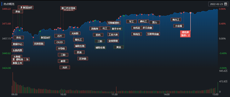 盤面來看,截至2月23日收盤,上證指數(shù)漲0.93%,深證成指漲1.9%,創(chuàng)業(yè)板指漲2.82%;滬深兩市合計(jì)成交額10409億元,突破一萬億元;總體來看,兩市個股普漲,有3608只個股上漲,其中有104只個股漲停報(bào)收。