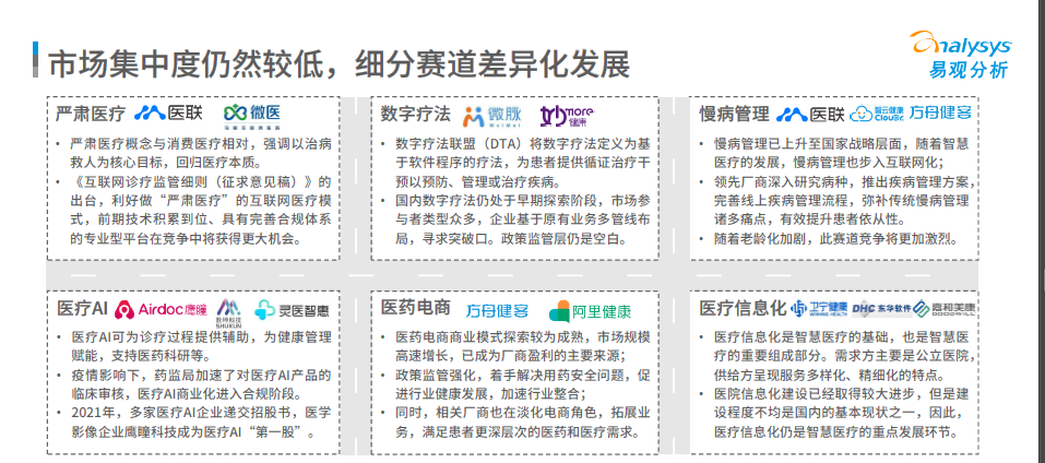 整體來看,市場集中度仍較低,行業(yè)呈多元化發(fā)展態(tài)勢,除醫(yī)藥電商外,慢病管理、醫(yī)療AI、數(shù)字療法、醫(yī)療信息化賽道均受關注程度較高。特別是自去年10月份《互聯(lián)網(wǎng)診療監(jiān)管細則(征求意見稿)》出臺之后,“嚴肅醫(yī)療”這個相對于消費醫(yī)療的概念,被頻繁提起,給出了行業(yè)發(fā)展的鮮明指向性,讓“醫(yī)歸醫(yī),藥歸藥”。報告指出,前期技術積累到位、具備完善合規(guī)體系的專業(yè)型平臺在競爭中將獲得更大機會。