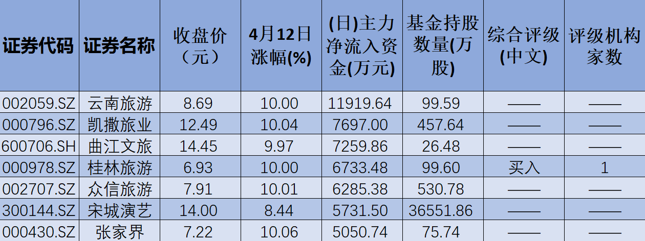 表:4月12日,景點(diǎn)及旅游板塊獲得大單資金凈流入額超5000萬元個(gè)股一覽