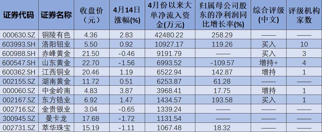 受金價不斷上行影響,黃金股已開始獲得資金青睞。4月以來,截至4月14日,東方財富黃金概念板塊期間累計上漲5.62%。從資金層面看,4月份以來,板塊內(nèi)共有17只個股獲得大單資金凈流入,期間累計凈流入額為9.38億元。個股方面,銅陵有色(42480.22萬元)和洛陽鉬業(yè)(10927.17萬元)的大單資金凈流入額均超過1億元。