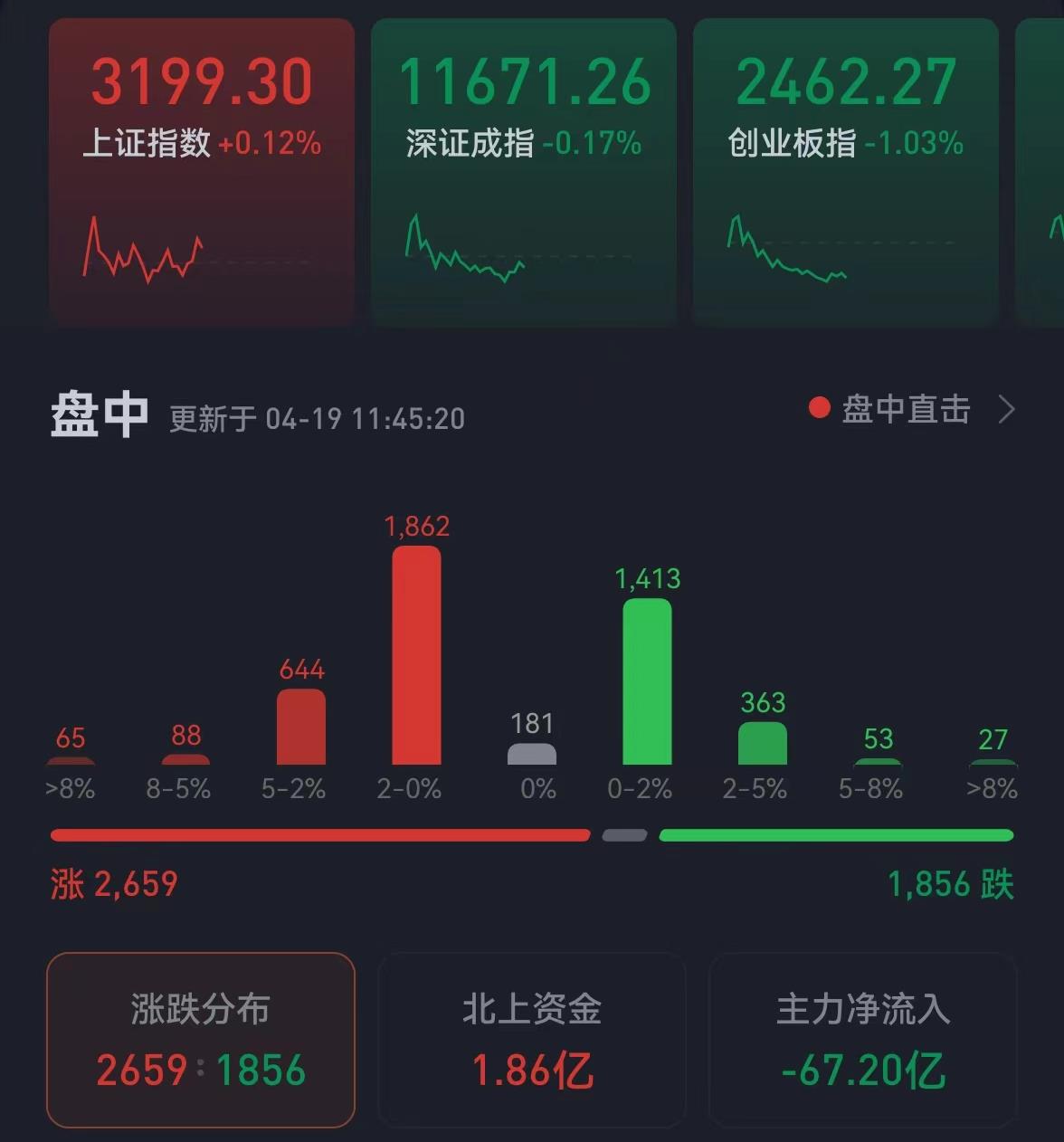4月19日,A股三大指數(shù)漲跌不一。截至上午收盤,上證指數(shù)漲幅達(dá)0.12%,報(bào)3199.30點(diǎn);深證成指和創(chuàng)業(yè)板指跌幅分別為0.17%和1.03%;滬深兩市合計(jì)成交額4850億元;總體來看,兩市個(gè)股漲多跌少。
