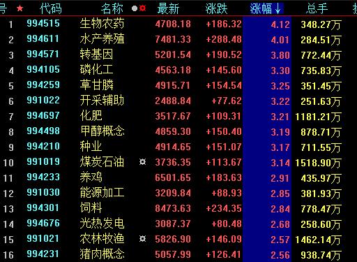 與此同時(shí),農(nóng)業(yè)股繼續(xù)上漲,生物農(nóng)藥、水產(chǎn)養(yǎng)殖、化肥、養(yǎng)雞、飼料、豬肉概念、農(nóng)林牧漁等相關(guān)細(xì)分板塊,紛紛上揚(yáng),漲幅居前。截至4月19日上午,利民股份、江山股份、豐山集團(tuán)、藍(lán)豐生化等個(gè)股集體漲停。