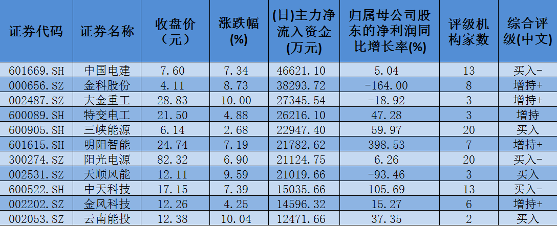 資金也是推動風電板塊指數(shù)上漲的重要因素,截至5月19日收盤,風電板塊共有100只個股獲得大單資金凈流入,凈流入額達到42.74億元。其中,包括中國電建、金科股份、大金重工、特變電工、三峽能源、明陽智能、陽光電源、天順風能、中天科技、金風科技、云南能投等在內(nèi)的11只個股獲得大單資金凈流入額超過1億元。