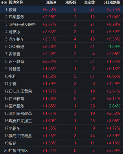 從同花順指數(shù)看,教育板塊指數(shù)漲幅居前,收?qǐng)?bào)3609.06點(diǎn),漲幅達(dá)6.50%。