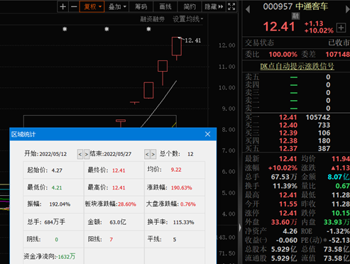 5月27日,中通客車?yán)^續(xù)強(qiáng)勢(shì)上漲,開盤12分鐘封住漲停,截至收盤,封板買一單達(dá)105742手。該股自5月12日以來連續(xù)12日上漲,累計(jì)上漲190.63%,最近11個(gè)交易日連續(xù)拉漲停板。