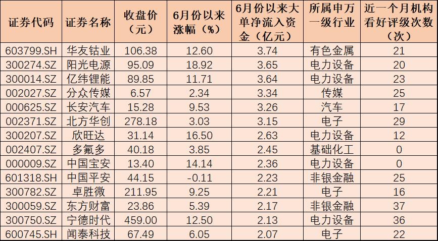 隨著A股市場成交活躍,大單資金動向引發(fā)投資者關注。東方財富Choice數(shù)據顯示,6月份以來,有1512只個股期間呈大單資金凈流入態(tài)勢,占A股總數(shù)為31.35%。其中,華友鈷業(yè)、陽光電源、億緯鋰能、分眾傳媒、長安汽車、北方華創(chuàng)等6只個股期間大單資金凈流入額均超3億元,期間合計大單資金凈流入為20.78億元。