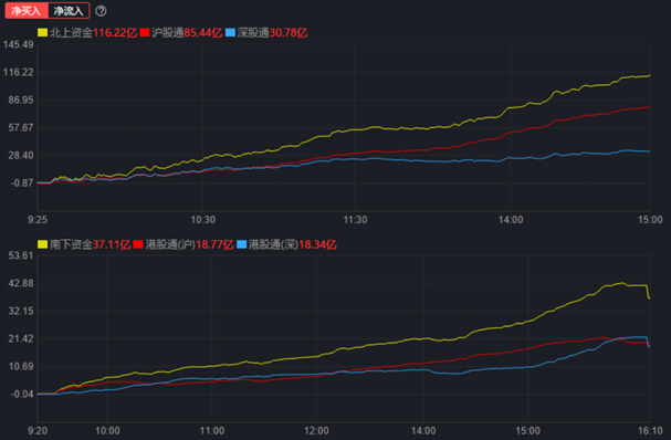 北向資金今日呈凈流入態(tài)勢,全天凈買入116.22億元,其中,滬股通凈買入85.44億元,深股通凈買入30.78億元。