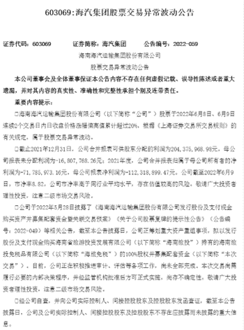 公告還顯示,公司于2022年5月28日披露了《海南海汽運輸集團股份有限公司發(fā)行股份及支付現(xiàn)金購買資產(chǎn)并募集配套資金暨關(guān)聯(lián)交易預(yù)案》《關(guān)于公司股票復牌的提示性公告》(公告編號:2022-049)等相關(guān)公告,截至本公告披露日,公司正籌劃重大資產(chǎn)重組事項,擬以發(fā)行股份及支付現(xiàn)金購買海南省旅游投資發(fā)展有限公司(以下簡稱“海南旅投”)持有的海南旅投免稅品有限公司(以下簡稱“海旅免稅”)的100%股權(quán)并募集配套資金(以下簡稱“本次交易”)。目前,公司正在積極推進審計、評估等各項工作,尚未全部完成。本次交易尚需履行必要的內(nèi)部決策程序,并經(jīng)監(jiān)管機構(gòu)批準后方可正式實施,尚存不確定性。敬請廣大投資者理性投資,注意二級市場交易風險。