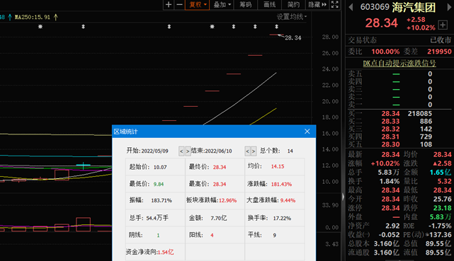 6月10日,海汽集團繼續(xù)漲停,這是該股實現(xiàn)14連陽走勢,且最近9個交易日均實現(xiàn)一字漲停板,14日累計漲幅達181.43%。截至今日收盤,海汽集團報28.34元,成交額達1.65億元,換手率1.84%,買一封單達218085手。