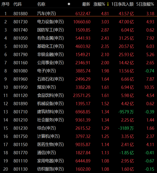 從申萬一級行業(yè)看,汽車行業(yè)漲幅居前,收報6122.47點,漲幅達4.81%。