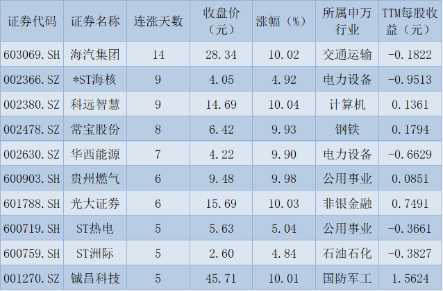 海汽集團14連陽9日一字板