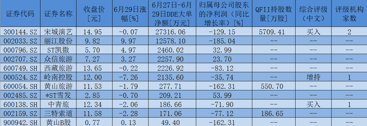 表:6月27日-6月29日,景點及旅游板塊呈現(xiàn)大單資金凈流入個股一覽