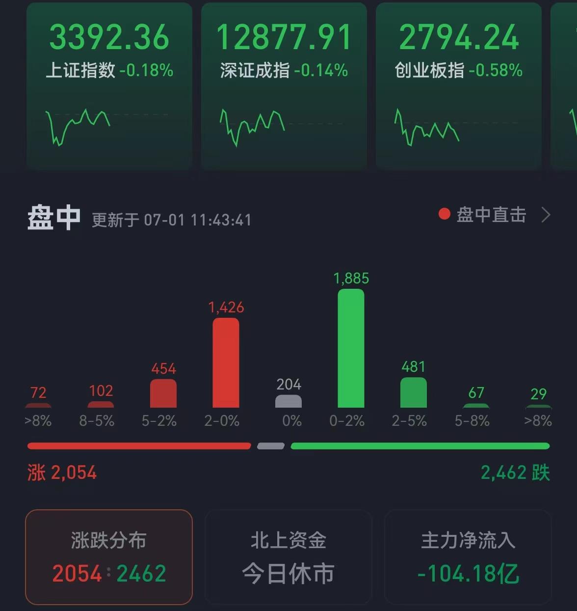 周五(7月1日),三大股指震蕩回落。截至上午收盤,上證指數(shù)跌0.18%,報3392.36點,失守3400點整數(shù)關口;深證成指和創(chuàng)業(yè)板指跌幅分別為0.14%和0.58%;滬深兩市合計成交額6701.8億元;總體來看,兩市個股漲少跌多。