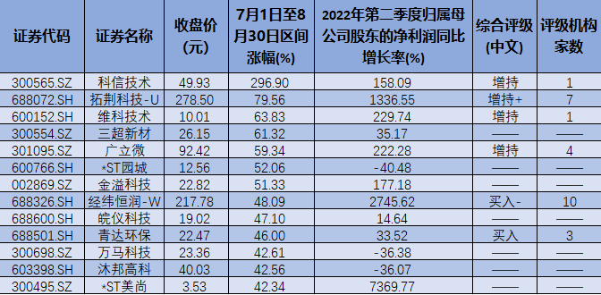 表:7月1日至8月30日,在233只二季度實(shí)現(xiàn)扭虧為盈股中漲幅超40%個(gè)股一覽