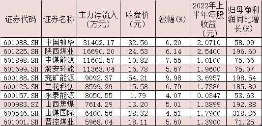 表:9月5日主力資金凈流入超5000萬(wàn)元的煤炭股