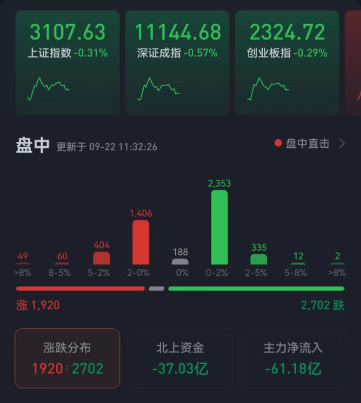 周四,中國三大股指低開后震蕩走強,全線收綠。截至上午收盤,上證指數(shù)跌0.31%,盤中一度失守3100點;深證成指和創(chuàng)業(yè)板指跌幅分別為0.57%和0.29%;滬深兩市合計成交額4032.7億元,總體來看,兩市個股跌多漲少。