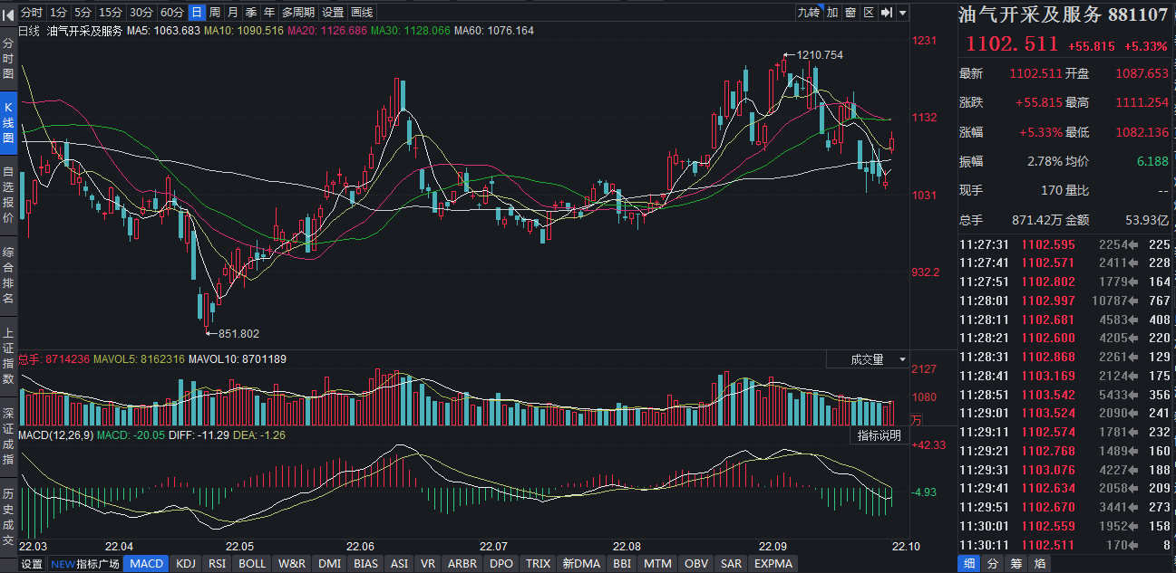 受國際油價顯著反彈等因素的影響,10月10日,A股同花順油氣開采及服務板塊表現(xiàn)強勢,截至11:30,油氣開采及服務板塊指數(shù)漲5.33%,位居同花順行業(yè)漲幅榜前列,大幅跑贏上證指數(shù)(跌幅0.39%)。板塊內(nèi)21只個股全部實現(xiàn)上漲,其中,貝肯能源漲停。